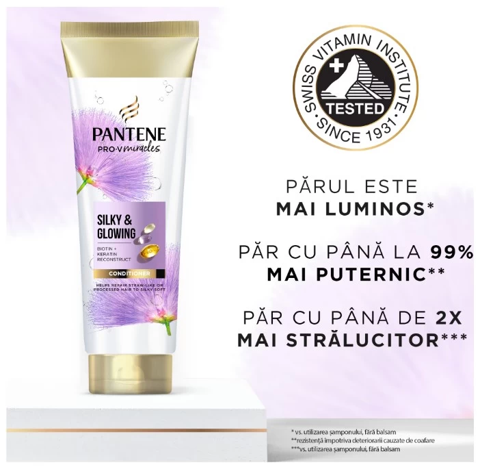 Adu inapoi la viata parul tern, decolorat, cu balsamul de par Pantene Silky & Glowing.