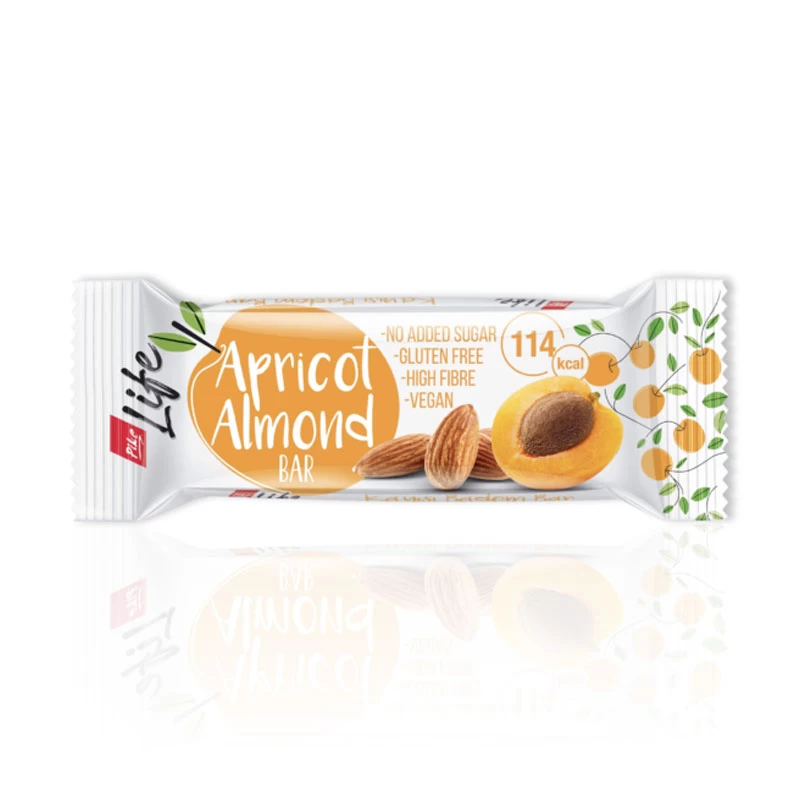 Baton cu caise & migdale – fără zahăr adăugat, gluten-free, bogat în fibre, vegan. ~114 kcal/baton.