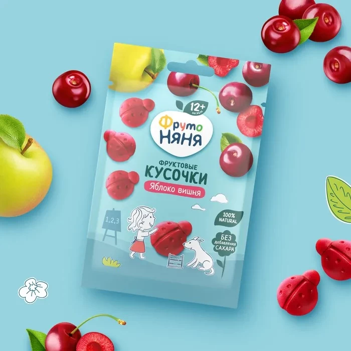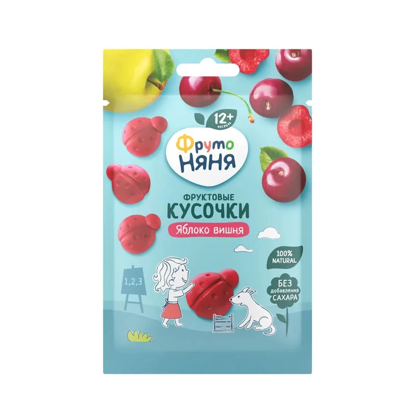 Vă prezentăm o noutate! Bucăți de fructe FrutoNanya cu mere și cireșe, în forma fermecătoare a gărgărițelor. Conțin doar fructe și fructe de pădure naturale, fără adaosuri inutile: fără zahăr, arome sau coloranți. Noua combinație de arome variate va diversifica dieta micuțului dumneavoastră. Cu bucățele de fructe FrutoNyană puteți răsfăța micuțul fără griji!