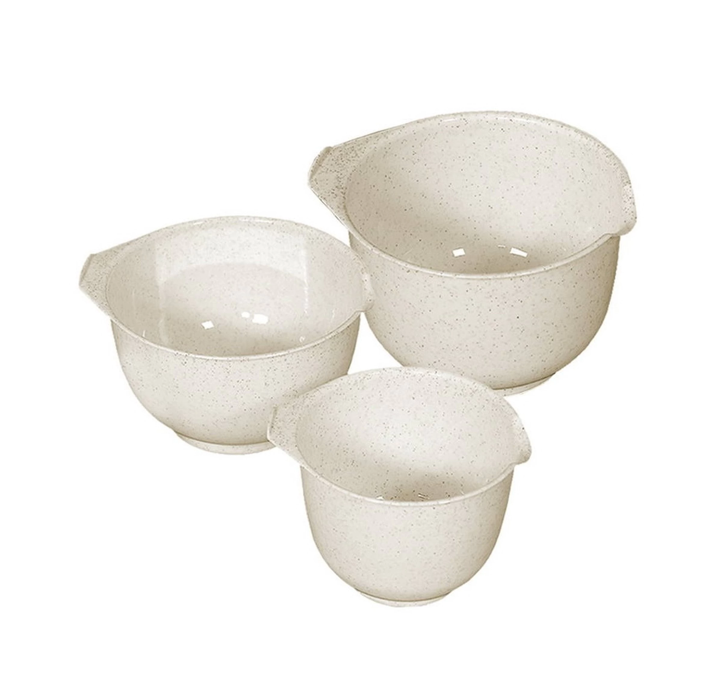 Trei boluri de bucătărie de dimensiuni diferite, utile pentru frământarea aluatului, baterea smântânii și prepararea unei varietăți de mâncăruri.