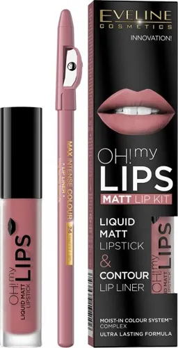 Oh!my Lips este un set de produse de machiaj pentru buze perfect asortate: un ruj lichid mat și un creion de contur de aceeași culoare.