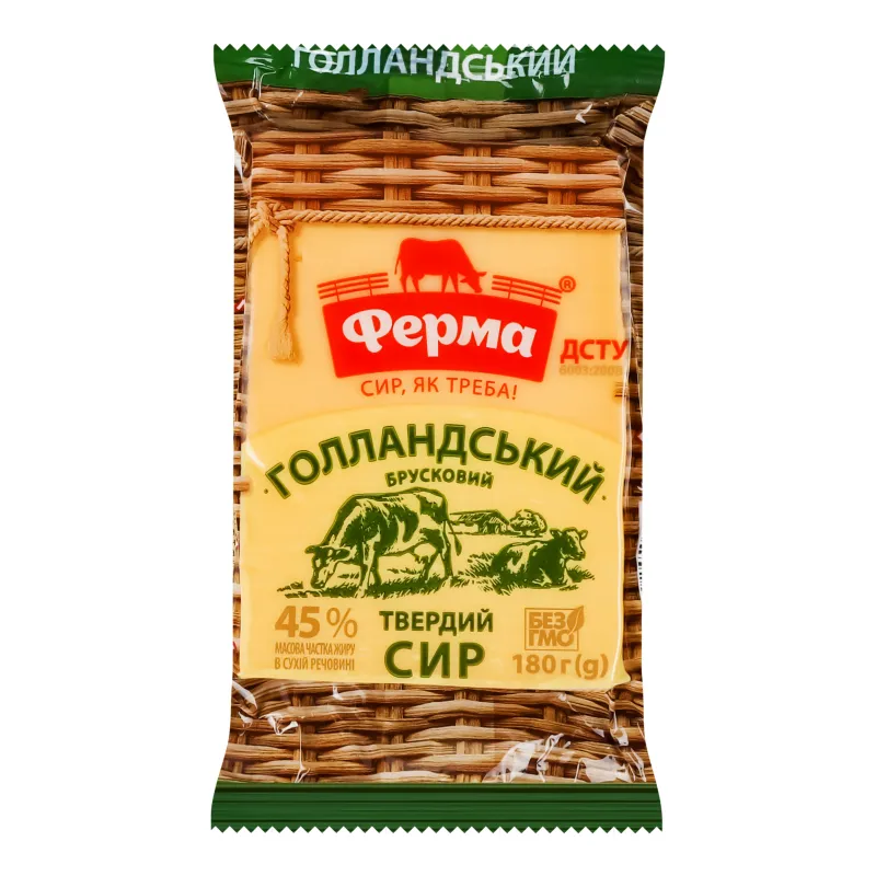 Brânză tare olandeză în formă de bară cu 45% grăsime în conformitate cu DSTU 6003:2008. Ingrediente: lapte de vacă integral, lapte de vacă degresat, sare, stabilizator clorură de calciu, conservant nitrat de potasiu, starter de brânză, coagulant enzimatic al laptelui, colorant natural annatto.