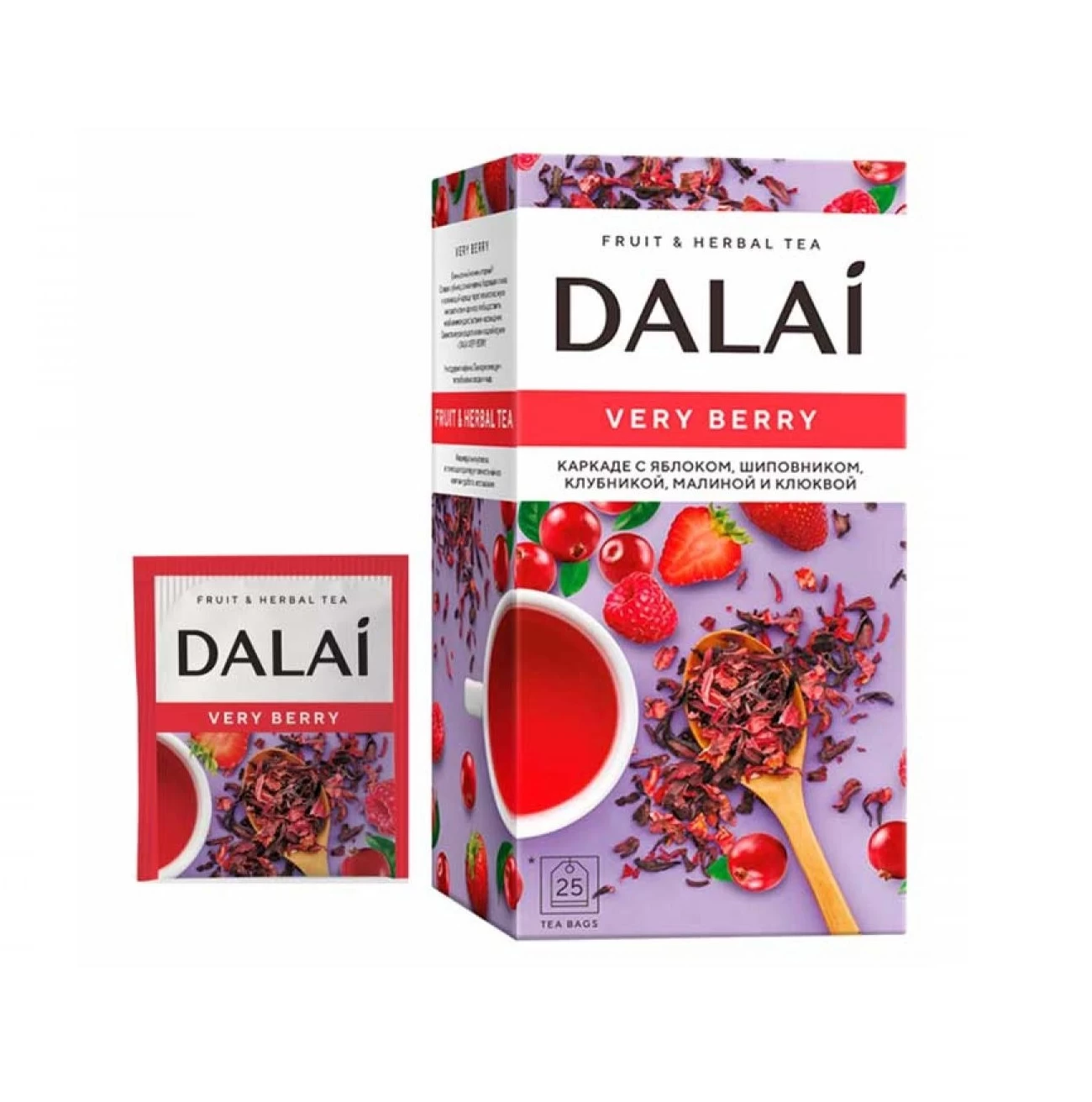 Dalai VERY BERR 25 plicuri ceai băutură este CARCADE CU MĂR, MERE, CLUBBERRY, Zmeură, Zmeură și Cranberry.