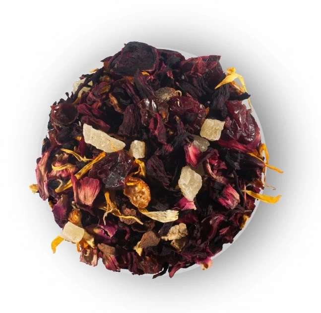 Deliciosul amestec de ceai Royal Dessert de la Lovare - petale de trandafir sudanez "karkade", cireșe, ananas și bucăți de măceșe, coajă de portocală, petale de trandafir chinezesc și calendula, scorțișoară și cuișoare. Aromă naturală "Cherry".