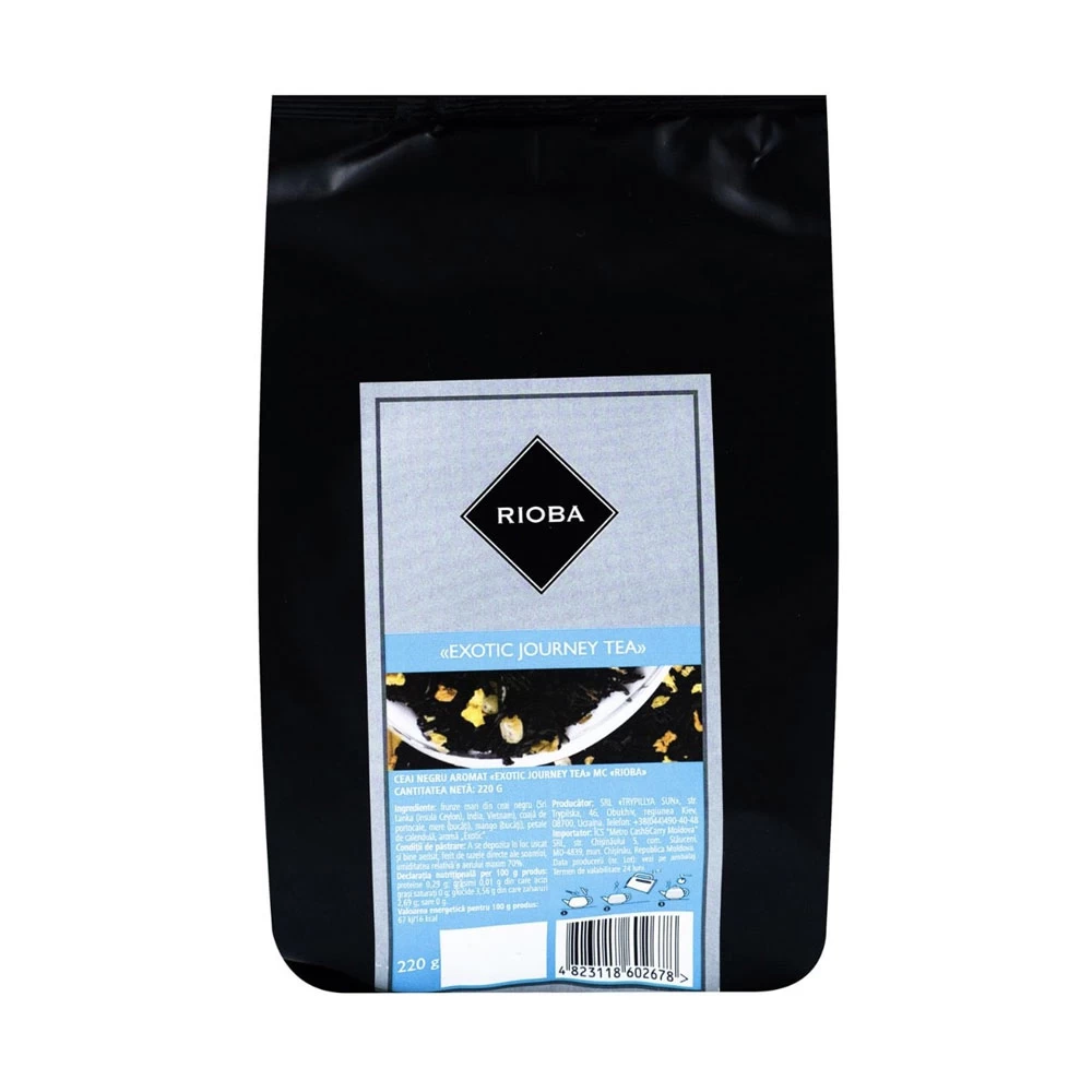 RIOBA – Exotic Journey Tea (HORECA, 220 g) – ceai negru aromat cu note tropicale (mango/ananas & citrice). Gust corpolent de ceai negru, final dulce-fructat. Bun și ca ice tea.