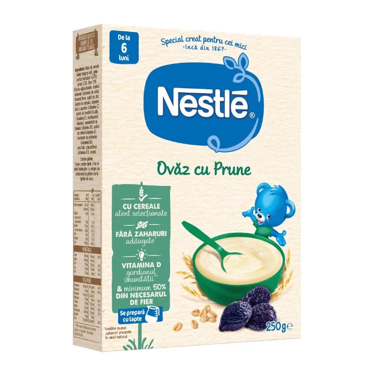 Oferă-i puiului tău delicioasele cereale din ovăz cu prune, din gama Nestlé Wellbeing. 1 castronel pe zi de cereale NESTLÉ pentru sugari asigură în mare parte toți nutrienții esențiali pentru o creștere optimă. Conține Bifidus BL și Imunonutrienți precum Zinc, Fier, Vitamina C și Vitaminele A și D. Imunonutrienții ajută la susținerea mecanismelor naturale de apărare ale bebelușului zi de zi.