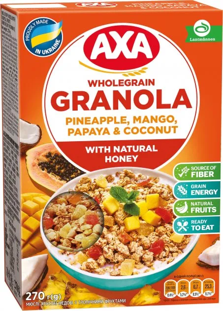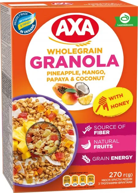 Ingrediente: fulgi de ovăz 39,5%, zahăr, chipsuri de nucă de cocos, biluțe de orez (crupe de orez, crupe de ovăz, zahăr, extract de malț de orz, sare de bucătărie), făină de grâu, fulgi de porumb bucăți de ananas 3,5%, chipsuri de banane 3,5%, bucăți de papaya 3%, glucoză, miere naturală 2,5%, bucăți de mango 1%, sare de bucătărie, vitamina E.