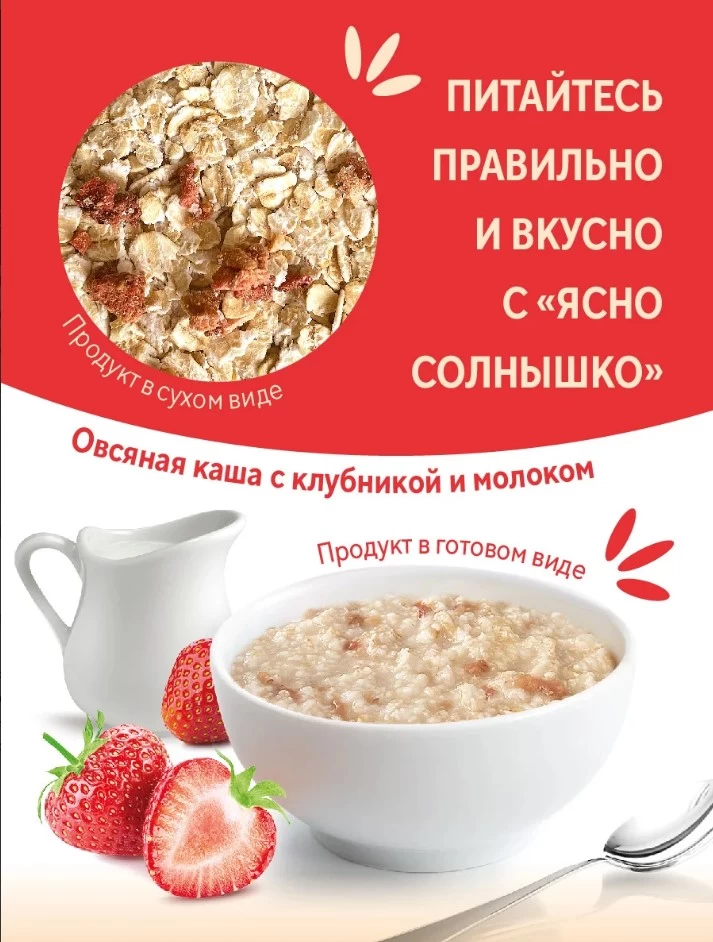 Fulgi de ovăz care nu necesită fierbere, zahăr, zer praf de lapte, bucăți de căpșuni uscate, lapte praf integral, sare.