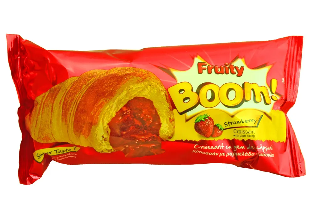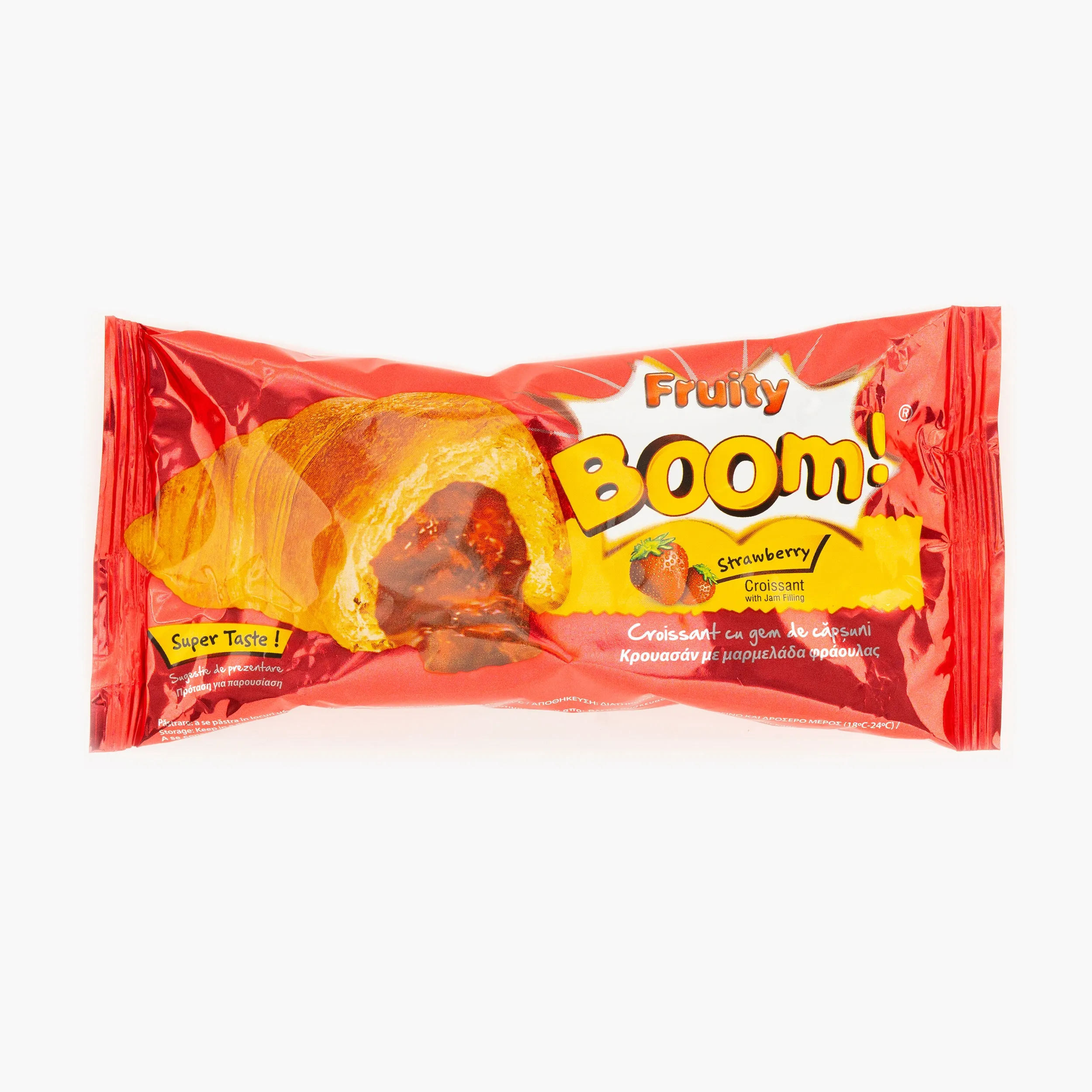 Croissantul cu gem de căpșuni se remarcă prin gustul bogat de cacao ce desăvârșește aroma miezului pufos.