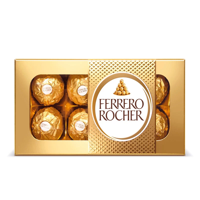 Ferrero Rocher este o bomboană rafinată cu alune întregi în interior, cremă delicată de nuci într-o bilă de napolitană crocantă acoperită cu ciocolată cu lapte cu alune tocate.