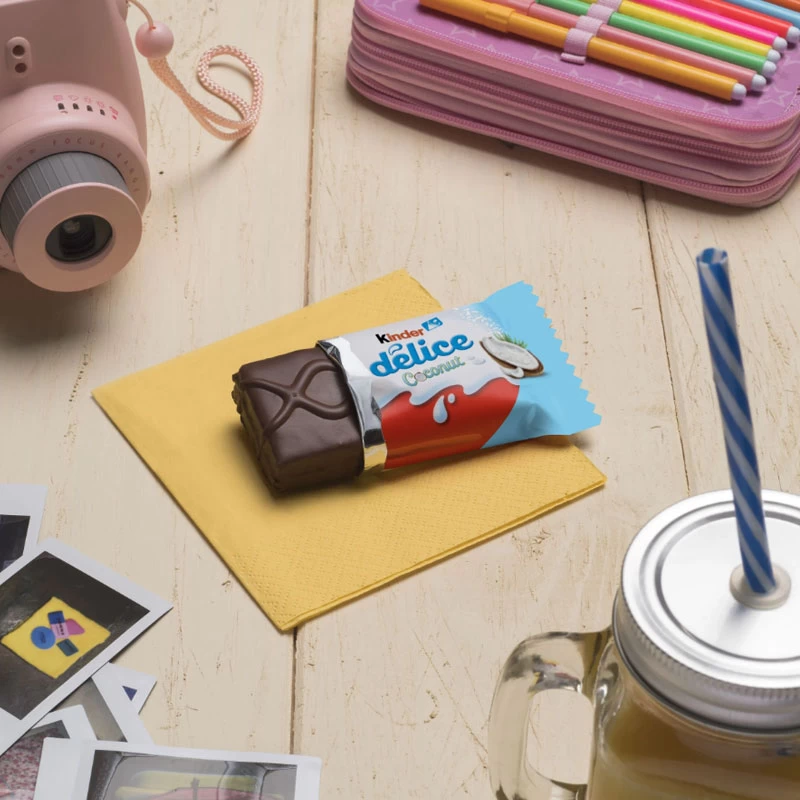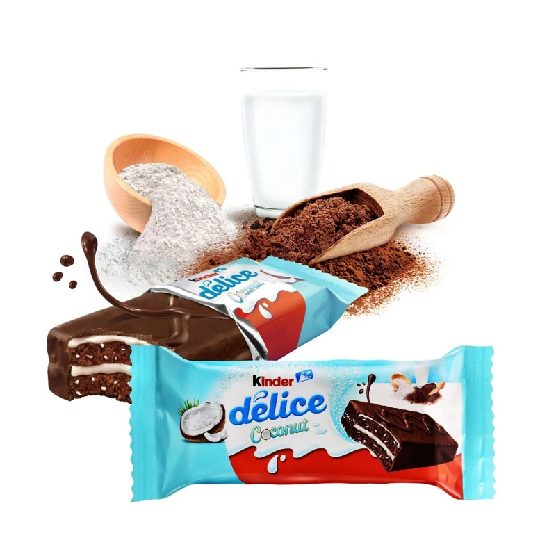 Prăjitură din biscuiți cu umplutură de cocos, acoperită cu glazură de cacao. Ambalajul etanș permite păstrarea calităților gustative deosebite și a prospețimii biscuiților pufoși, a glazurii delicate de ciocolată și a umpluturii de cocos. Nutritiv și cu un gust intens, Kinder Delice Cocos se potrivește perfect oricărei ocazii în care doriți să gustați ceva și să vă răsfățați!
