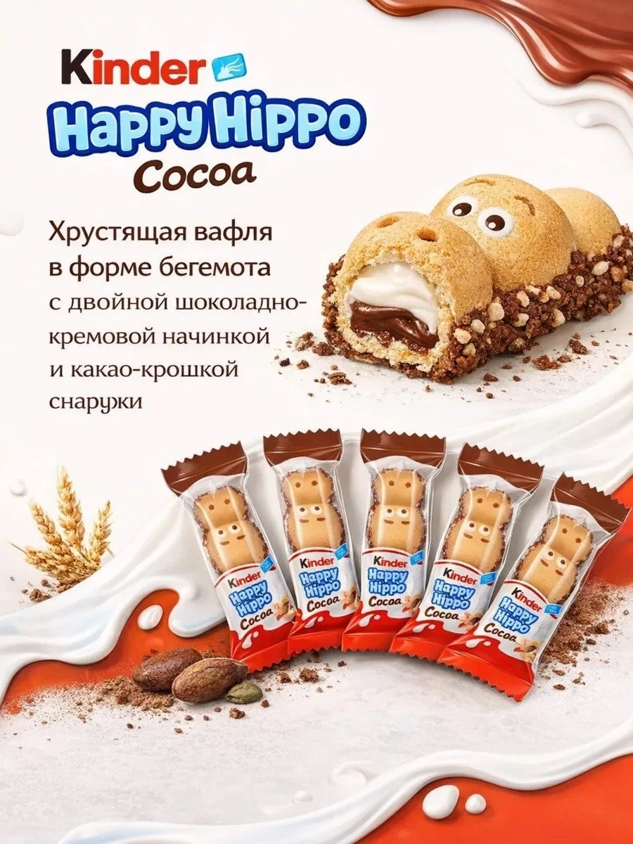 Biscuiții Kinder Happy Hippo sunt o serie limitată de biscuiți cu cacao și alune. În fiecare pachet veți găsi 5 hipopotami în ambalaje individuale, ceea ce îi face un cadou excelent pentru copii.