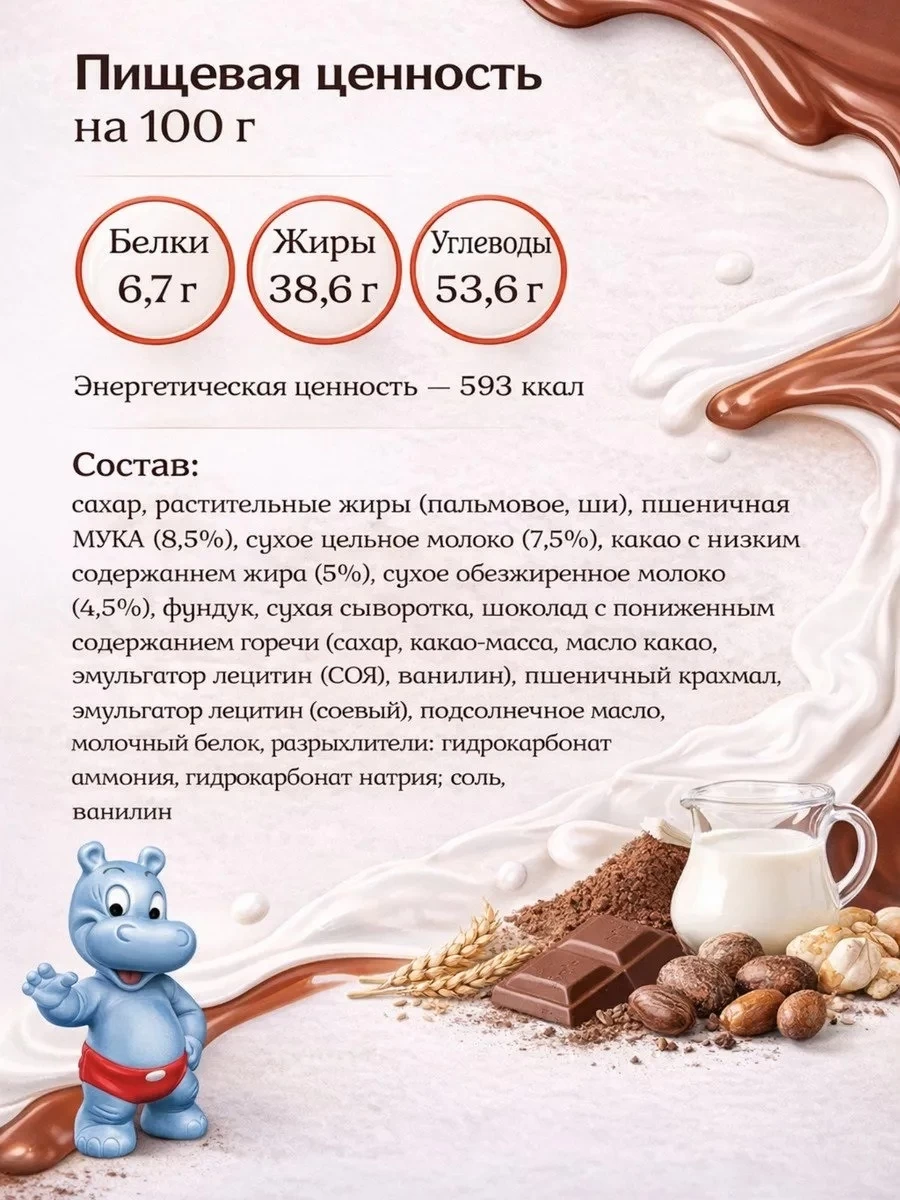 O particularitate a acestor biscuiți este umplutura din lapte condensat și alune, care se combină cu vafele crocante. Acest lucru îi face nu doar delicioși, ci și atrăgători pentru copii. Compoziția biscuiților include o mulțime de ingrediente benefice, precum zahăr, grăsimi vegetale, făină de grâu, cacao degresată, alune, zer dulce praf, ciocolată semi-amăruie, amidon de grâu și altele.