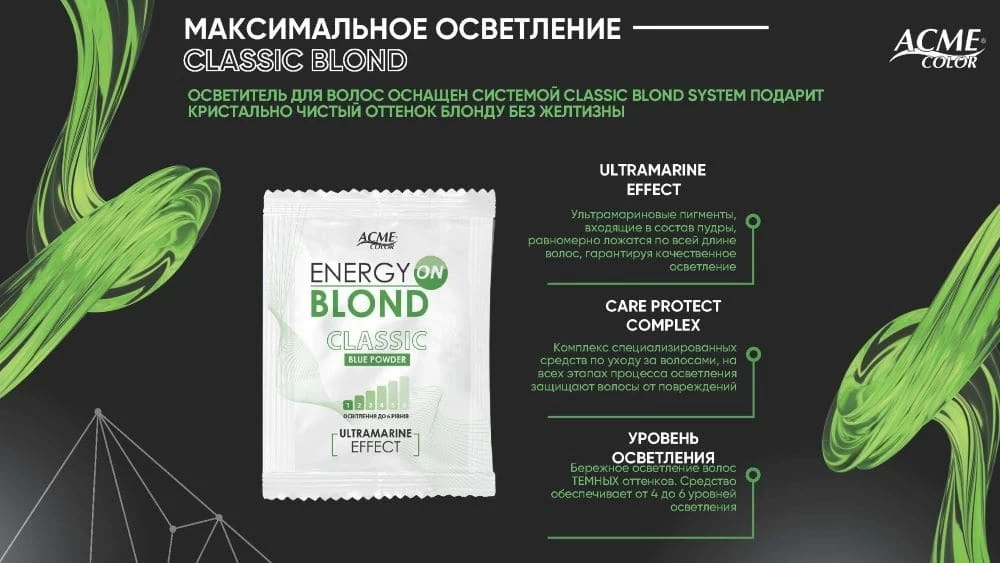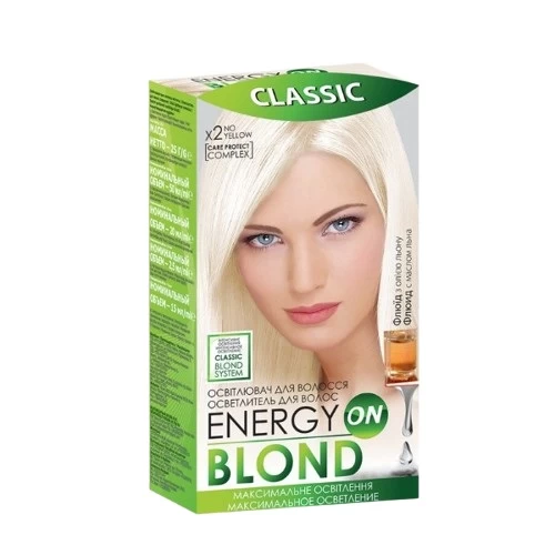 Decolorantul de păr cu CLASSIC BLOND SYSTEM va oferi o nuantă de blond cristalin FĂRĂ GALBEN. Componenta principală a sistemului de decolorare a părului ENERGY BLOND ON Classic este pudra, care contine pigmenti ultramarini. Acești pigmenti vă permit să obtineti o deschidere de până la 4 - 6 tonuri, în functie de timpul de expunere a amestecului pe păr. Combinat cu un ulei fluid, balsam și mască, nu numai că vei obtine o nuantă uimitoare, dar, de asemenea, veti păstra calitatea părului.