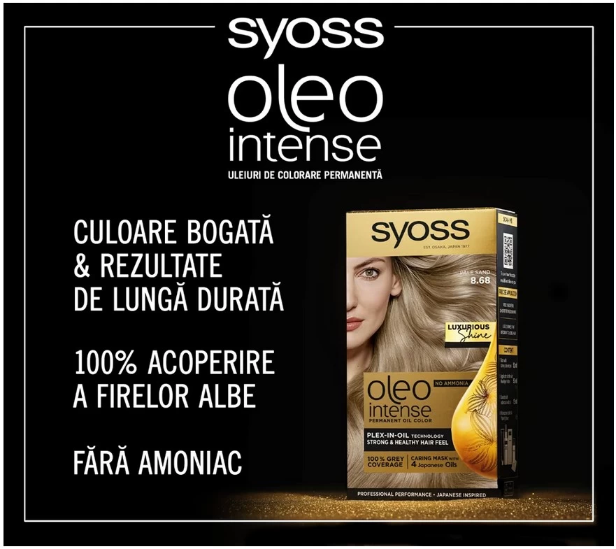 SYOSS OLEO INTENSE PERMANENT OIL COLOR este vopseaua de par conceputa pentru realizarea unei culori cu aspect sanatos. Cu o formula fara amoniac, blanda cu firul de par, asigura o acoperire totala a firelor albe.