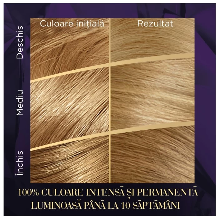 Aceasta vopsea de par ofera calitate de salon si lupta impotriva celor 7 semne ale parului deteriorat, oferind o culoare 100% intensa, luminoasa si hidratata. Lotiunea luxurianta Oil Color Cream, cu un parfum floral, hidrateaza si controleaza daunele. Tratamentul nostru cu Ser infuzat cu Ulei contine Plex, o tehnologie inspirata de saloane, capabila sa repare fibra de par, pentru un par puternic cu aspect sanatos. De asemenea, Reactivatorul de Culoare amplifica intensitatea si luminozitatea culorii intre vopsiri. Rezultatul? Par puternic in interior, culoare 100% intensa si un aspect sanatos la exterior. Culoare puternica care dezvaluie puterea ta interioara.