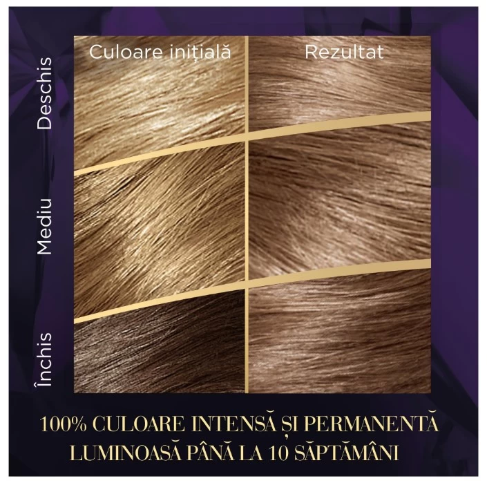 Aceasta vopsea de par ofera calitate de salon si lupta impotriva celor 7 semne ale parului deteriorat, oferind o culoare 100% intensa, luminoasa si hidratata. Lotiunea luxurianta Oil Color Cream, cu un parfum floral, hidrateaza si controleaza daunele. Tratamentul nostru cu Ser infuzat cu Ulei contine Plex, o tehnologie inspirata de saloane, capabila sa repare fibra de par, pentru un par puternic cu aspect sanatos. De asemenea, Reactivatorul de Culoare amplifica intensitatea si luminozitatea culorii intre vopsiri. Rezultatul? Par puternic in interior, culoare 100% intensa si un aspect sanatos la exterior. Culoare puternica care dezvaluie puterea ta interioara.