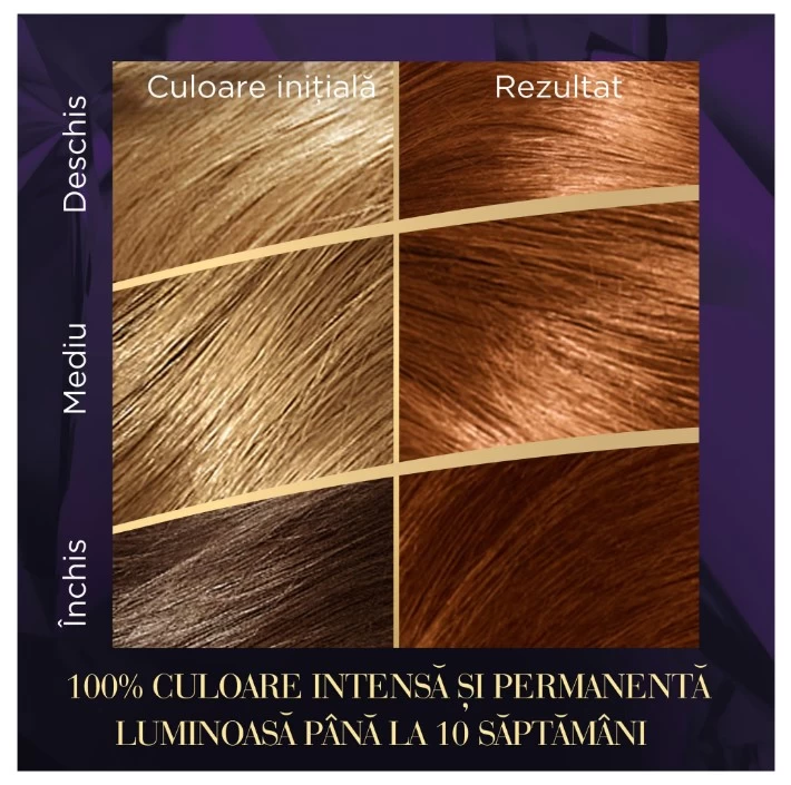 Aceasta vopsea de par ofera calitate de salon si lupta impotriva celor 7 semne ale parului deteriorat, oferind o culoare 100% intensa, luminoasa si hidratata. Lotiunea luxurianta Oil Color Cream, cu un parfum floral, hidrateaza si controleaza daunele. Tratamentul nostru cu Ser infuzat cu Ulei contine Plex, o tehnologie inspirata de saloane, capabila sa repare fibra de par, pentru un par puternic cu aspect sanatos. De asemenea, Reactivatorul de Culoare amplifica intensitatea si luminozitatea culorii intre vopsiri. Rezultatul? Par puternic in interior, culoare 100% intensa si un aspect sanatos la exterior. Culoare puternica care dezvaluie puterea ta interioara.