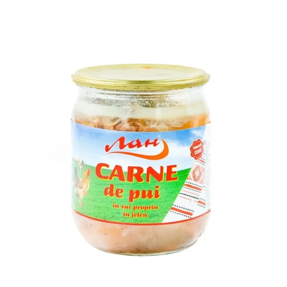 Carne de pui în suc propriu „Лан”, 500 g – o alegere practică și gustoasă pentru iubitorii de preparate tradiționale. Bucățile de pui sunt gătite lent, în suc propriu, și păstrate în jeleu natural pentru a-și menține frăgezimea și aroma. Ideală pentru a fi consumată ca atare, adăugată în salate, tocănițe sau garnituri, oferind o sursă naturală de proteine de calitate.