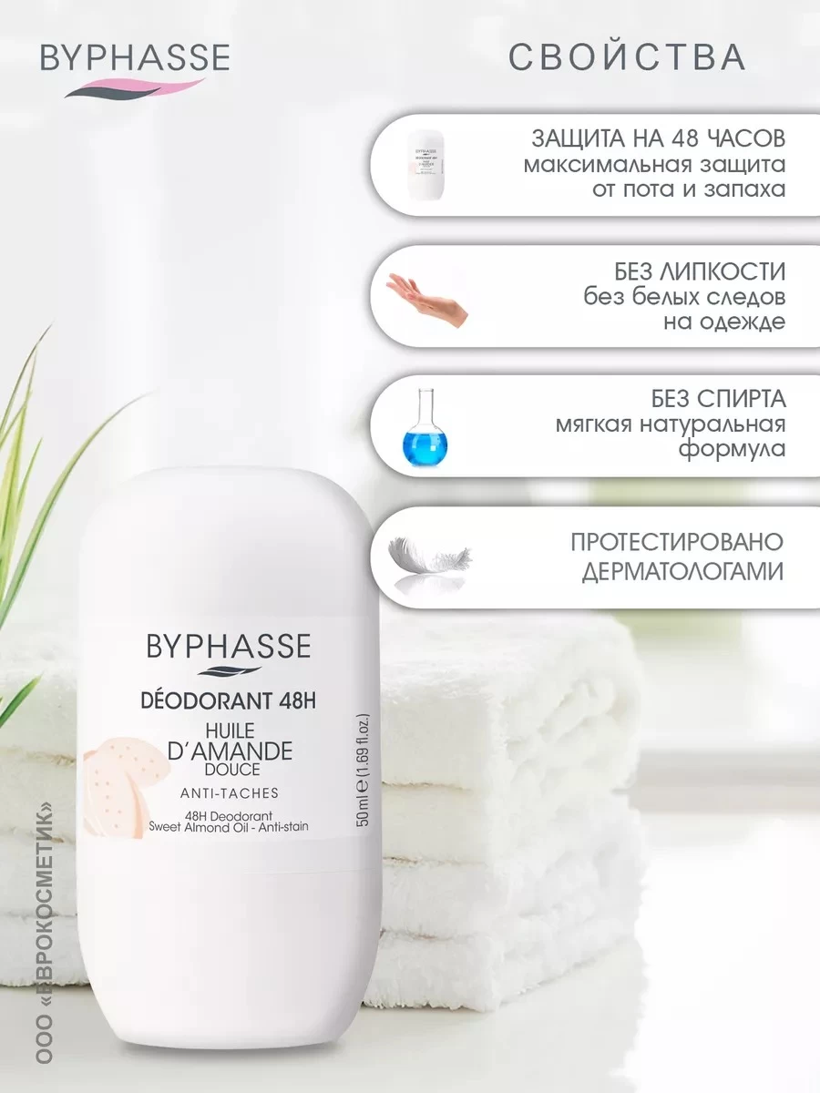 Noul format de deodorant roll-on de la brandul spaniol Byphasse oferă o formulă nouă cu protecție 48 de ore împotriva transpirației și mirosului, asigurând protecție și îngrijire zilnică, cu grijă pentru pielea delicată a axilei. Formula sa fără alcool catifelează și calmează pielea sensibilă. Reface, hidratează și previne iritațiile. Deodorantul roll-on se usucă rapid, fără a lăsa o senzație lipicioasă pe piele. Nu lasă pete pe haine.
