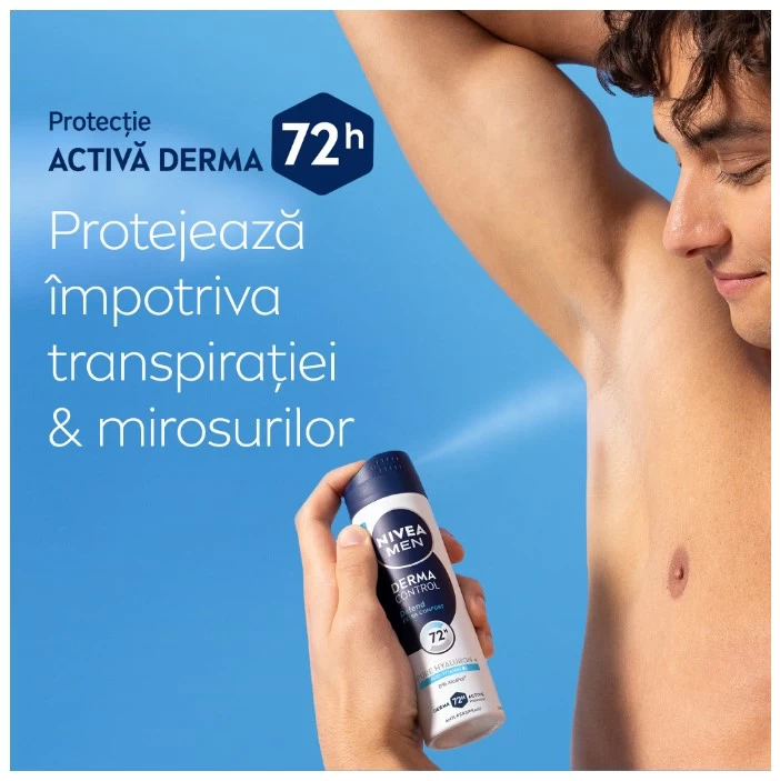 Antiperspirantul NIVEA MEN Derma Control Defend cu Acid Hialuronic si Pro-vitamina B5 hidrateaza si protejeaza pielea de iritatii. Formula avansata Derma Active Protection este eficienta impotriva transpiratiei timp de 72 de ore, oferind confort si prospetime pielii. Testat dermatologic. Fara alcool.