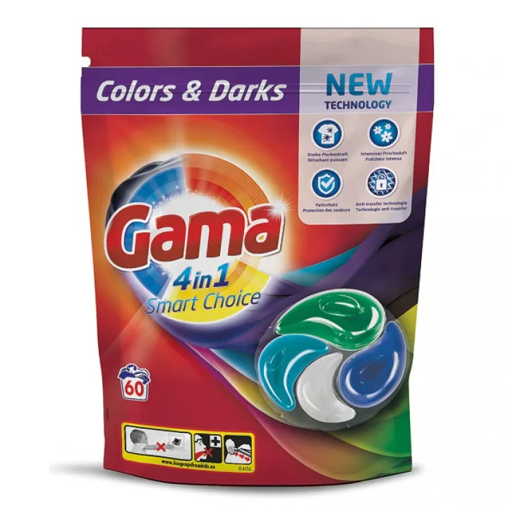 Gel-capsule pentru rufe Gama 4in1 Colors&Darks (pentru culori și discursuri închise la culoare) 60pcs Gama 4in1 gel-capsule pentru spălare este un detergent de rufe compact și inovator.