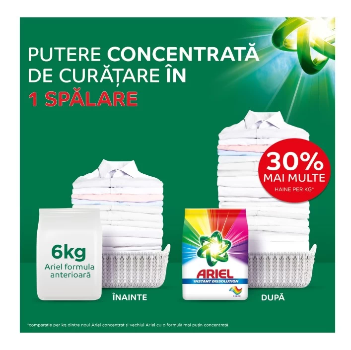 Acum, cu ajutorul formulei sale concentrate, detergentul pudra Ariel Color asigura o putere de curatare mai mare si spala mai multe rufe per kilogram, indepartand impecabil petele dintr-o singura spalare, protejand totodata culorile. Datorita tehnologiei unice de dizolvare instanta, pudra se dizolva rapid in contact cu apa si patrunde adanc in fibre, chiar si in ciclurile de spalare in apa rece.