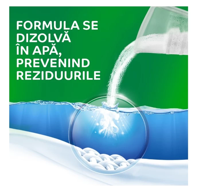 Cu tehnologie unica pentru dizolvare instanta chiar si in apa rece, care ajuta la prevenirea reziduurilor de pudra.