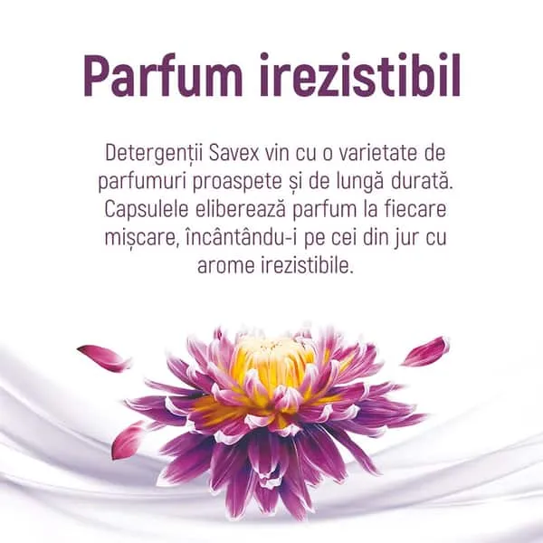Noua formula Savex are un sistem imbunatatit de indepartare a petelor care ofera un nivel premium de curatare printr-o singura spalare. Si, desigur, experienta spalarii hainelor nu ar fi completa fara parfumurile unice ale detergentului Savex.