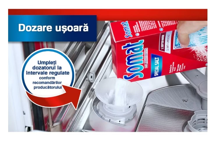 Sarea speciala pentru masina de spalat vase Somat are o puternica actiune anticalcar ce protejeaza optim masina de spalat vase, bratele pulverizatoare si tevile de depunerile de calcar, prelungind durata de viata a acesteia si imbunatatindu-i performanta. Sarea Somat ajuta la asigurarea functionarii perfecte a sistemelor pentru dedurizarea apei transformand astfel apa de la robinet in apa dedurizata, deoarece depunerile de calcar pot reduce rapid eficienta masinii de spalat vase. Dedurizarea apei permite detergentului sa actioneze la capacitate maxima in timpul ciclurilor de spalare rezultand in vase stralucitoare, fara pete si urme de apa.
