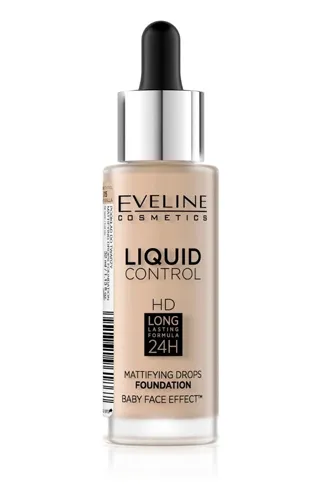 Fondul de ten inovator Liquid Control HD Mattifying Drops de la Eveline Cosmetics este un fond de ten de nouă generație, cu o consistență lichidă, non-grasă și extrem de ușoară, pentru un efect natural maxim de "a doua piele".
