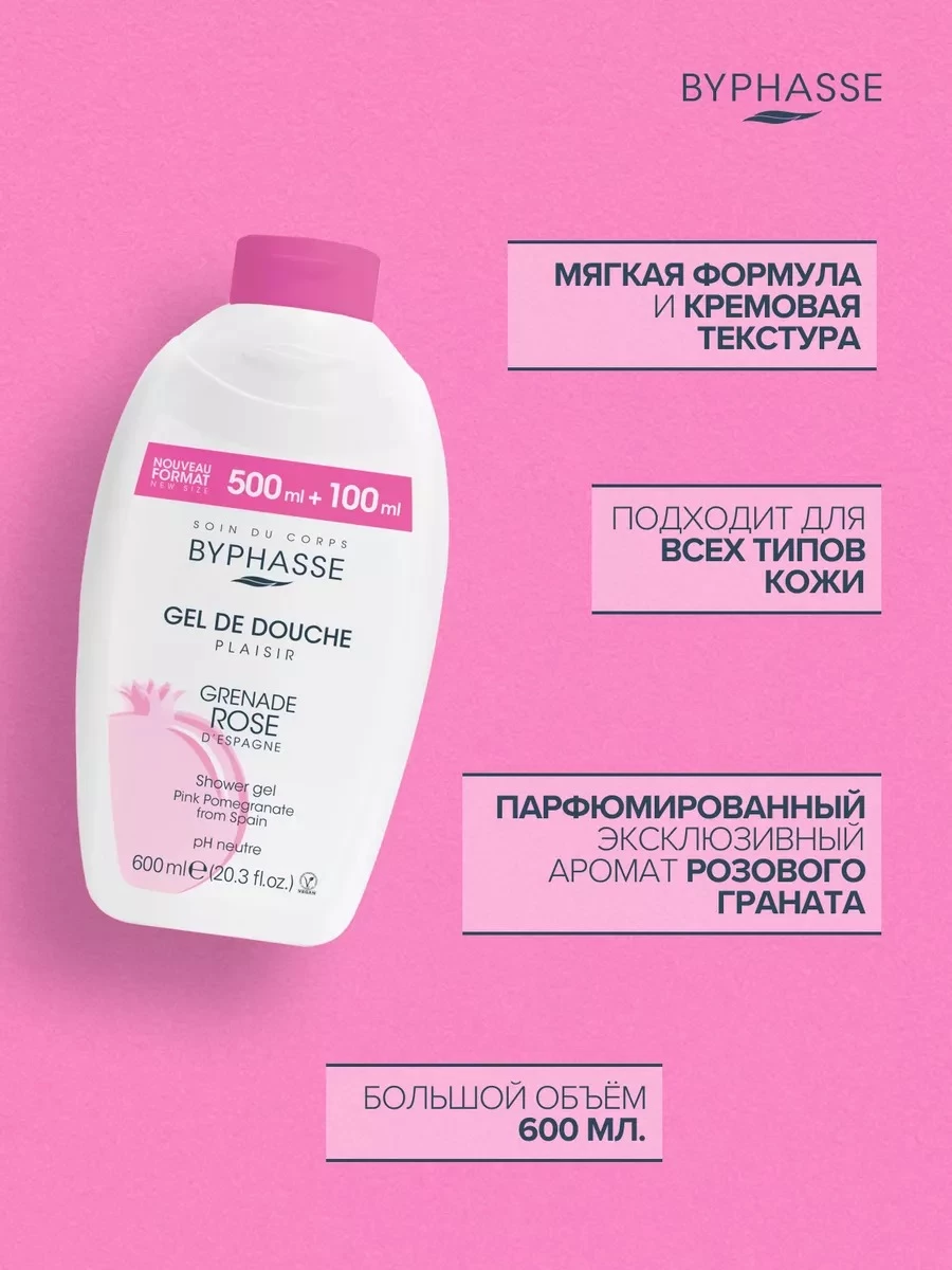 Gel de duș cu extract de rodie roz Byphasse — produs natural pentru curățarea pielii, cu un parfum fructat intens de rodie coaptă care rămâne pe piele după utilizare. Extractul de rodie roz, un antioxidant puternic, protejează pielea împotriva acțiunii radicalilor liberi, responsabili de îmbătrânirea prematură.