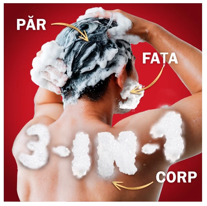 Gel de dus si sampon 3-in-1: Are putere 3-in-1, functionand ca gel pentru corp-par-fata. Spuma fina pentru o curatare in profunzime a murdariei si mirosurilor neplacute. Prospetimea de durata pe care si-o doreste toata lumea.