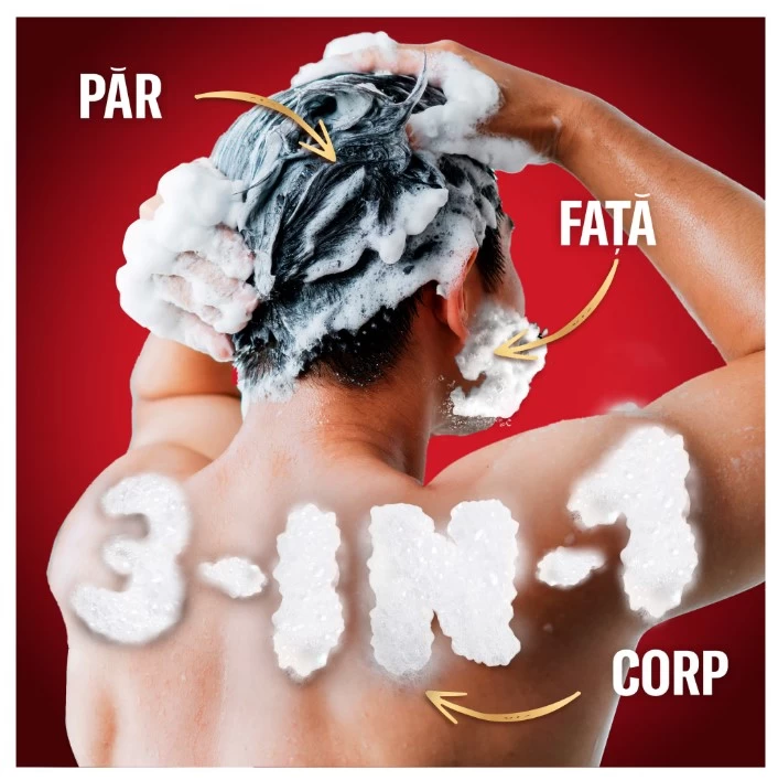 Gel de dus si sampon 3-in-1: Are putere 3-in-1, functionand ca gel pentru corp-par-fata. Spuma fina pentru o curatare in profunzime a murdariei si mirosurilor neplacute. Prospetimea de durata pe care si-o doreste toata lumea.