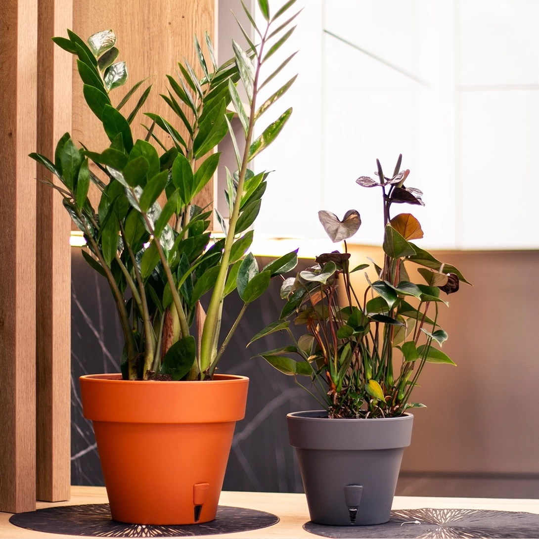 Latina, un ghiveci pentru plante cu sistem de auto-udare și cutie de drenare. Ghivechiul interior este proiectat cu funcție de drenare pentru umiditate optimă și alimentare cu oxigen a rădăcinilor. Cutia de drenare montată în interior reglează optim umiditatea solului.