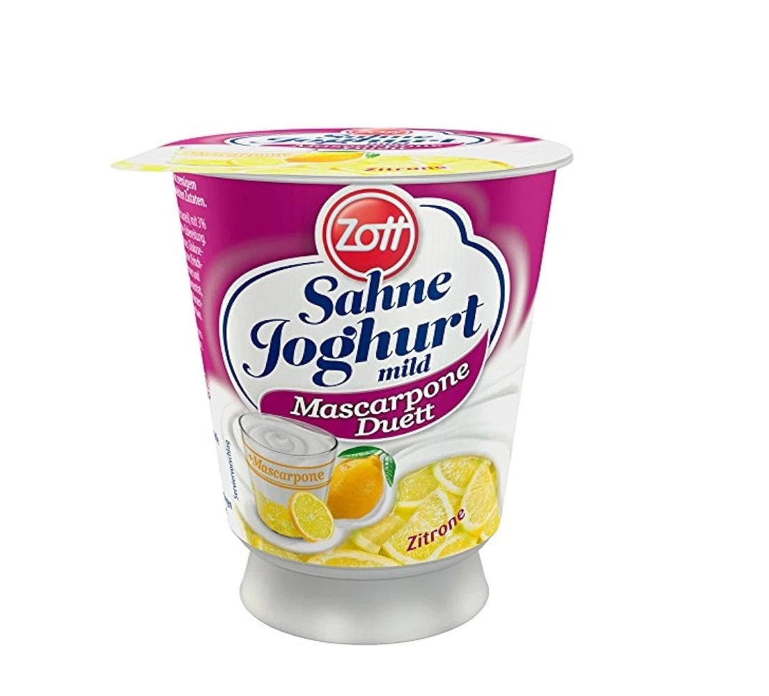 Ingrediente: smântână ușoară de iaurt, zahăr, apă, 3% mascarpone (brânză proaspătă, nivel dublu de smântână), 2,2% lămâi și suc de lămâie din concentrat de suc de lămâie, 1,4% suc de lime din concentrat de suc de lime, amidon modificat, aromă, colorant: riboflavină.