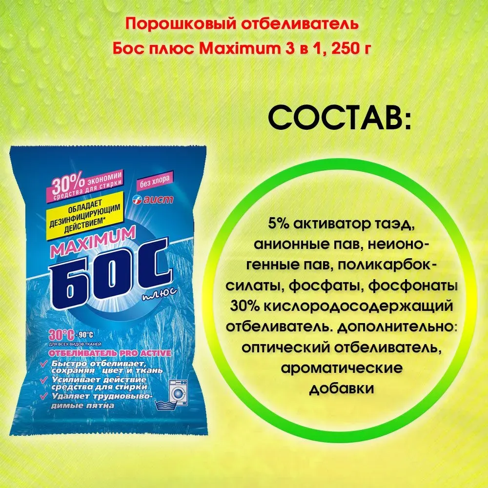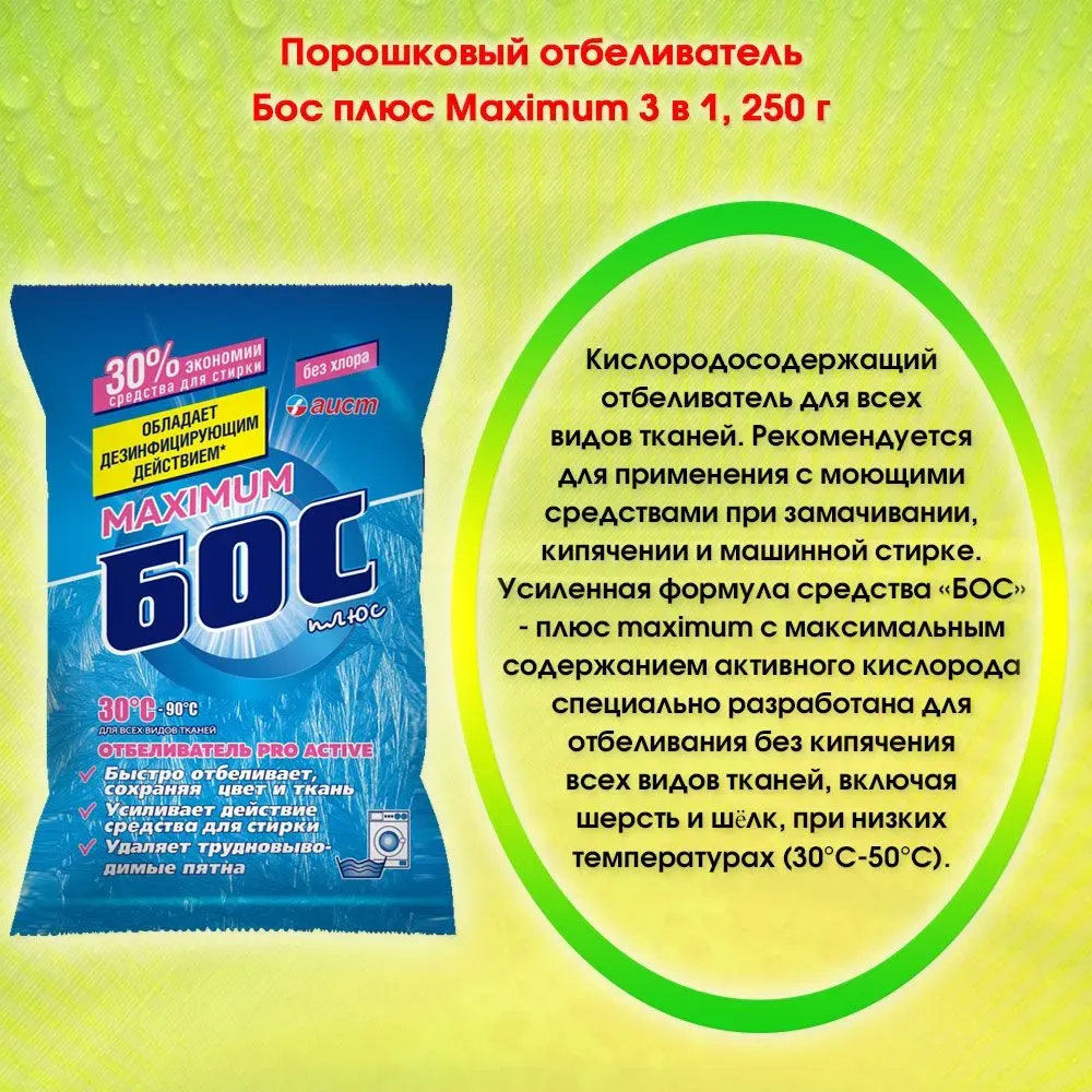 Formula întărită a produsului "BOS" - plus maximum cu conținut maxim de oxigen activ este special concepută pentru albirea fără fierbere a tuturor tipurilor de țesături, inclusiv a lânii și mătăsii, la temperaturi scăzute (30°C-50°C).