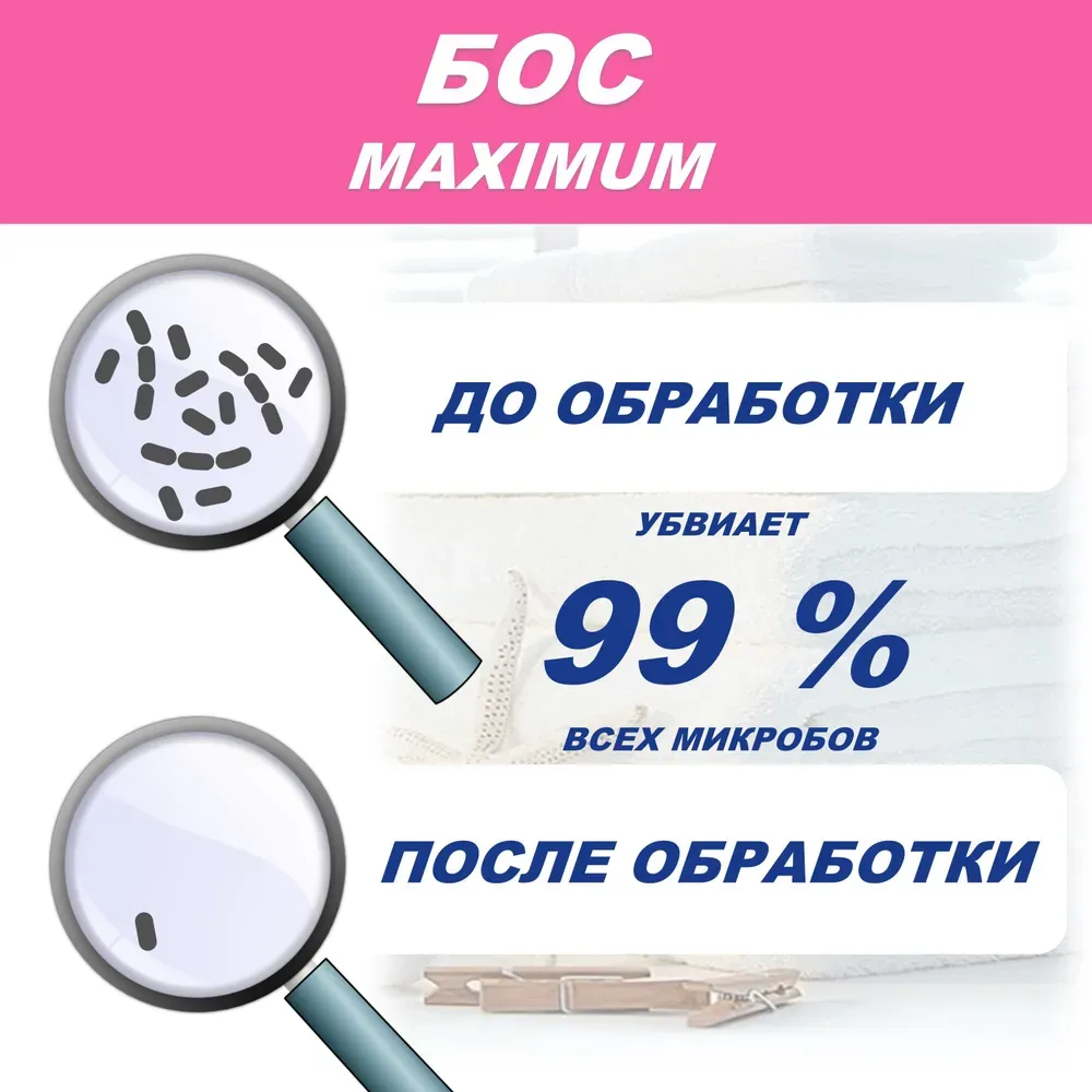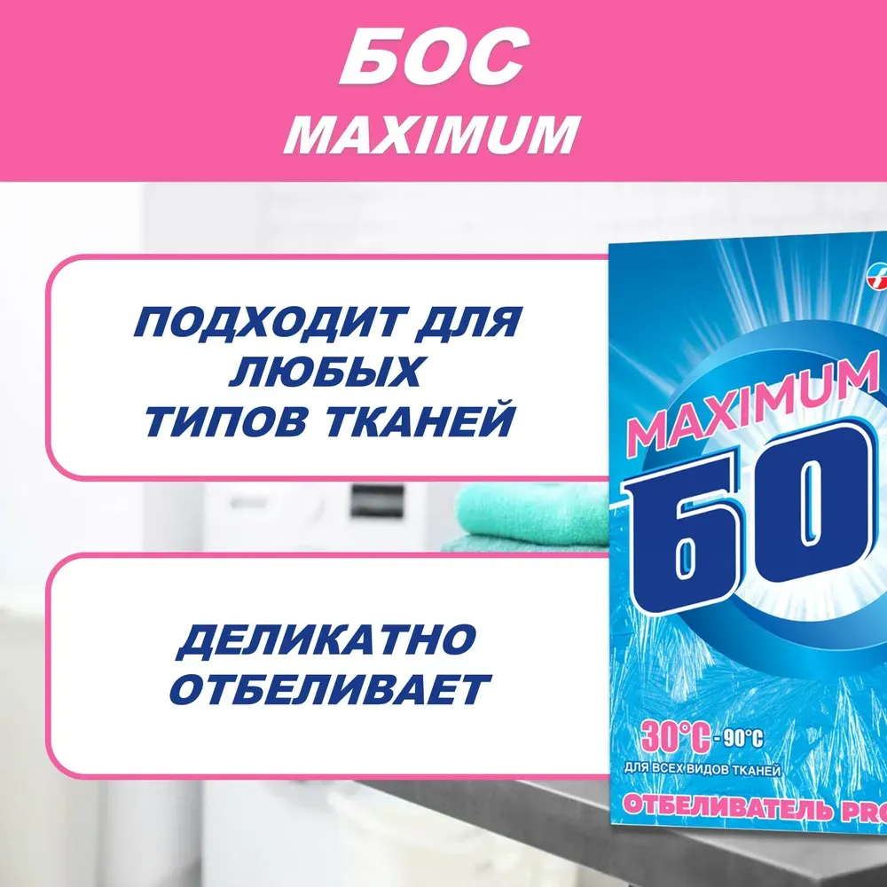 Formula întărită a BOS-plus cu un conținut maxim de oxigen activ a fost special concepută pentru înălbirea fără fierbere a tuturor tipurilor de țesături, inclusiv lână și mătase, la temperaturi scăzute (30-50ºC).