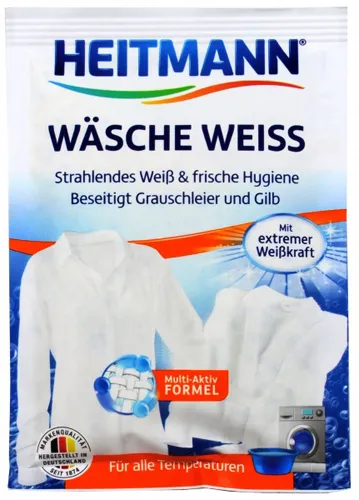 HEITMANN White Linen Bleach pentru toate temperaturile Wäsche-Weiss - Oricât de mult ați încerca, este imposibil să evitați petele în viața de zi cu zi. Cu produsele Heitmann nu aveți de ce să vă temeți! Gama largă are o soluție pentru toate tipurile de pete: cosmetice, cacao, ceai, sosuri sau murdărie de pe stradă.