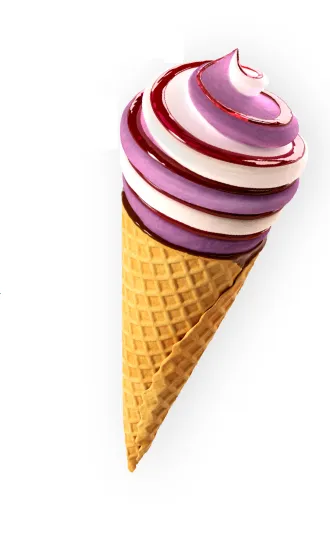 Înghețată de coacăze negre combinată cu vanilie și acoperită cu topping de coacăze negre într-un con de vafe crocante cu înveliș de ciocolată.