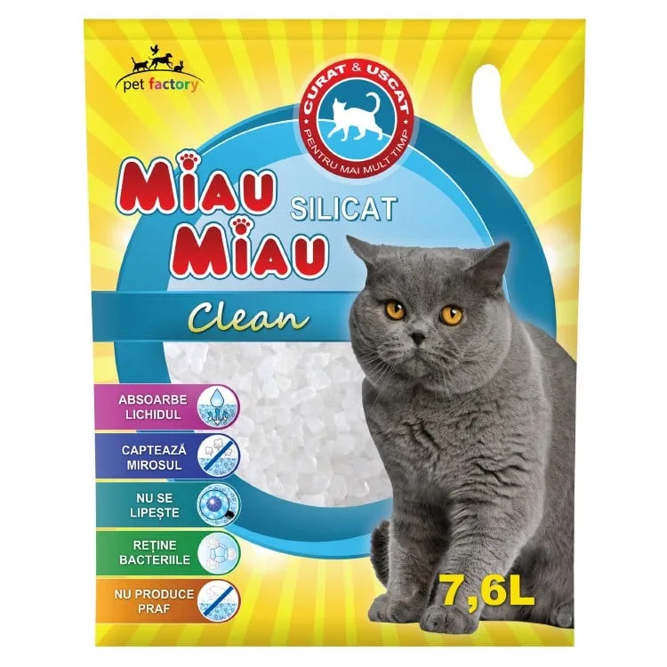 MIAU MIAU Silicat Clean 7.6L este un asternut igienic si absorbant din silicat natural, pentru litiera pisicii