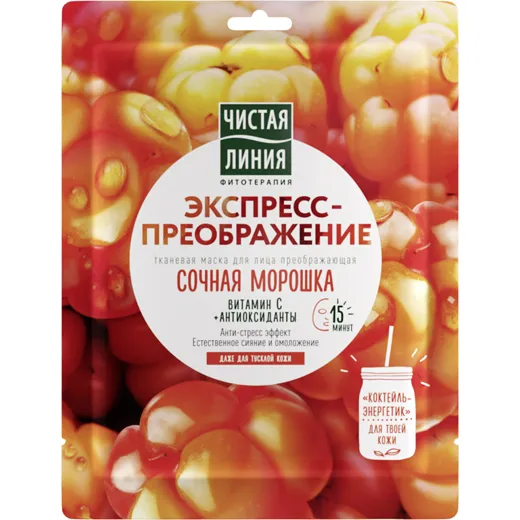 Masca Express Facial Tissue Mask cu vitamina C, mure suculente și antioxidanți oferă o strălucire naturală și întinerește pielea, lăsând-o moale și frumoasă. Murele de nori sunt bogate în antioxidanți naturali și previn efectele dăunătoare ale radicalilor liberi, oferind un efect antistres pielii. Acizii grași din cloudberry ajută la hidratarea pielii și la refacerea barierei sale de protecție. Vitamina C este o sursă de strălucire și energie pentru piele. Uniformizează eficient tonusul pielii.