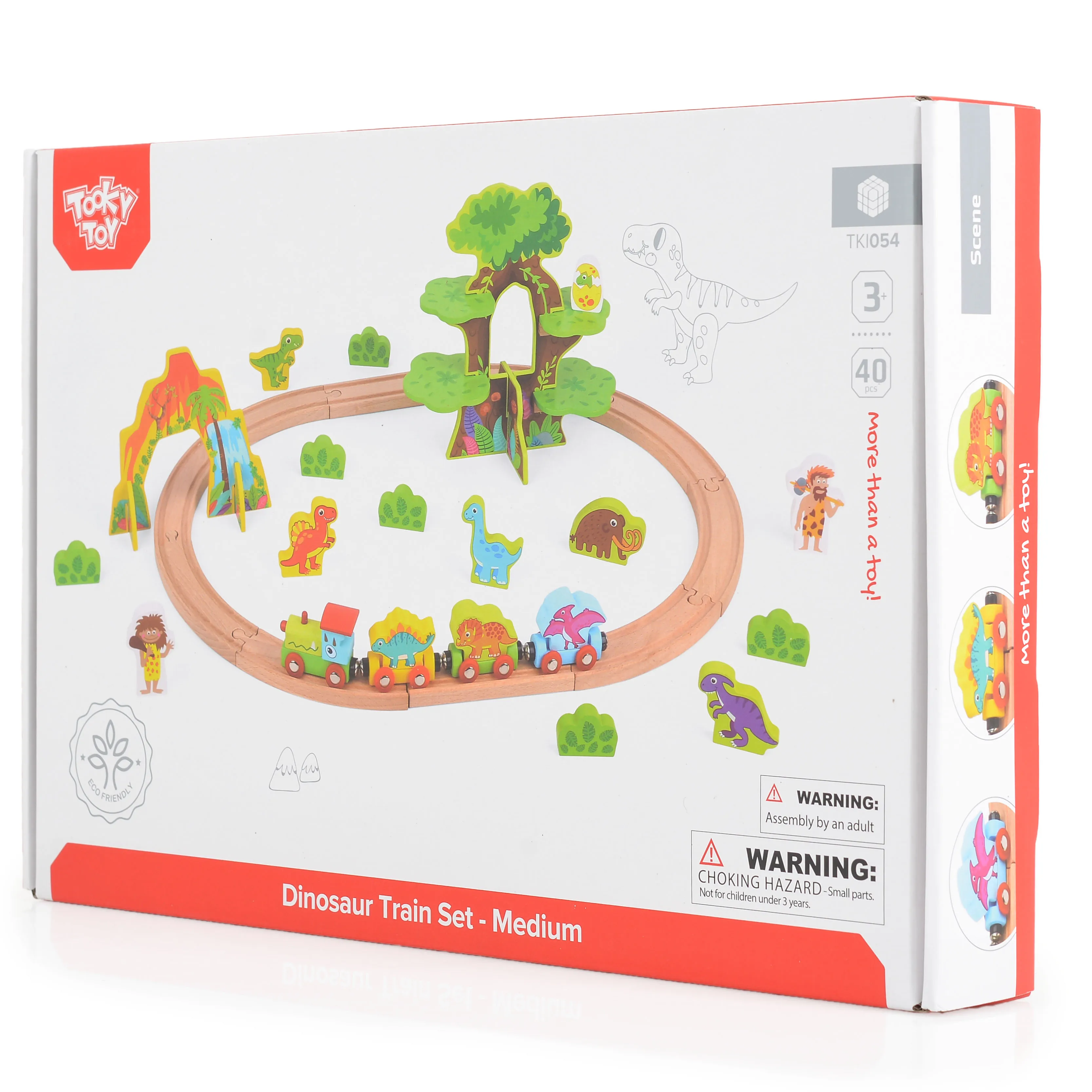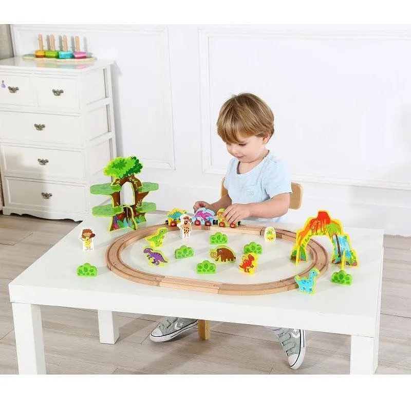 Combinând aceste două aspecte, Tooky Toy a creat un set minunat. Aceasta nu este doar o cale ferată din lemn, este un întreg parc de dinozauri. Setul este format din 39 de elemente, 10 fragmente de cale ferată pliabilă, un tren, 3 vagoane magnetice cu pasageri amuzanți. Aceasta este o jucărie minunată care nu vă va lăsa copilul indiferent și va dezvolta abilități atât de importante precum imaginația, abilitățile motorii și multe altele.