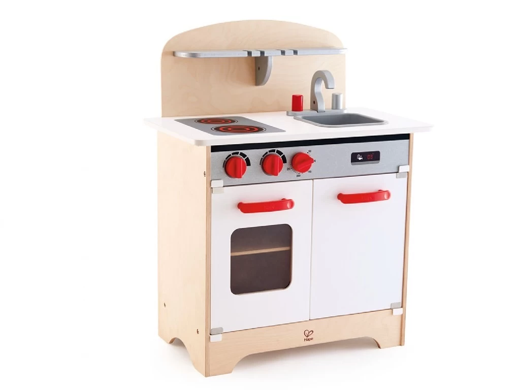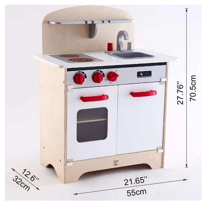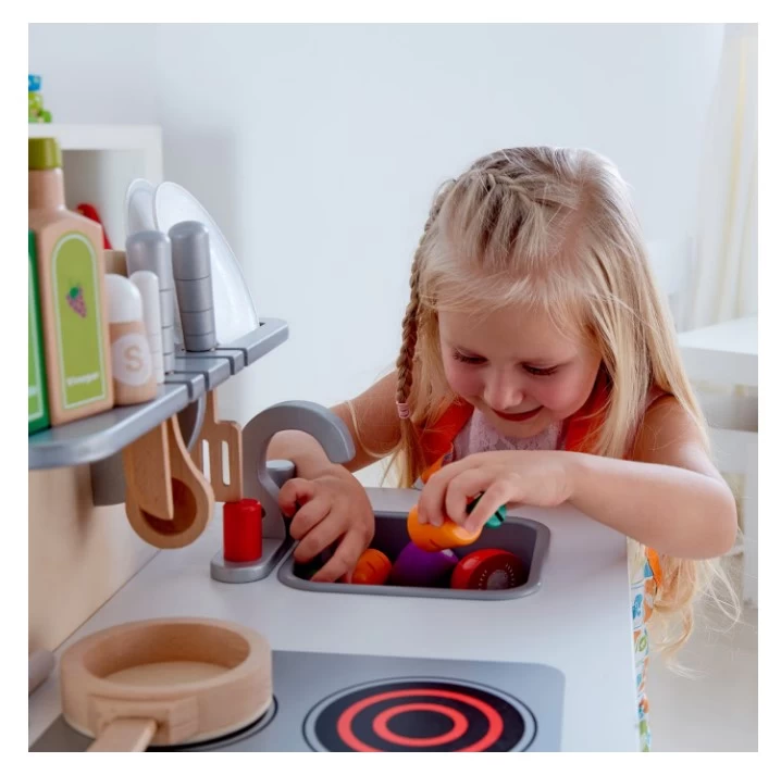 Set bucatarie, cu butoanele rotative, frigider cu raft, cuptor cu fereastra, robinet de apa si chiuveta, are tot ce aveti nevoie pentru a pregati o masa delicioasa. Bucataria White Gourmet este dotata cu blat de bucatarie cu raft si doua plite cu butoane reglabile, chiuveta cu doua butoane reglabile pentru apa calda si rece, frigider, dulap cu raft si cuptor cu fereastra si raft. Plitele includ butoane reglabile care fac clicuri realiste atunci cand sunt rotite. Chiuveta bucatariei si robinetele reglabile la cald si la rece pot fi indepartate pentru curatare. Cuptorul include o fereastra in usa pentru observare. Frigiderul si cuptorul includ ambele un raft. Jucariile sunt realizate din lemn, folosind materiale ecologice, vopsite in culori atragatoare cu vopsele nontoxice, care depasesc cele mai inalte si stricte standarde internationale de siguranta si calitate, precum EN71, ISO9001, ASTM F963 si altele.