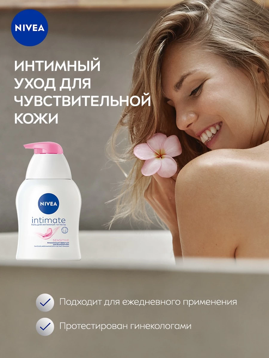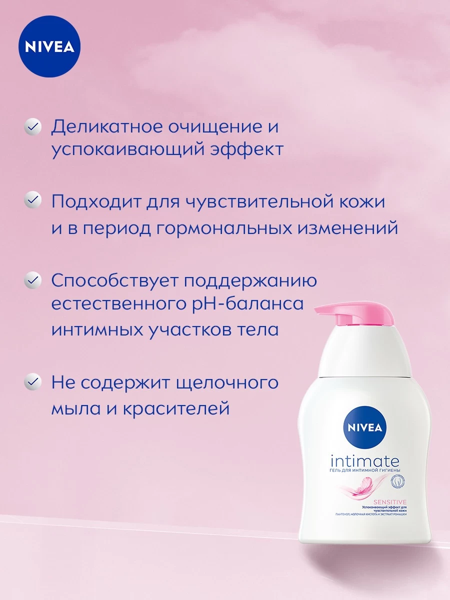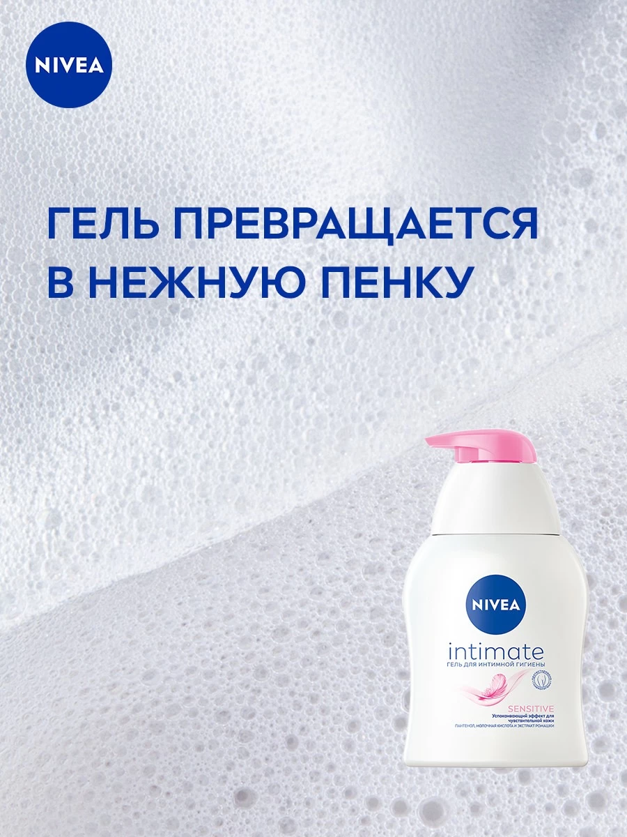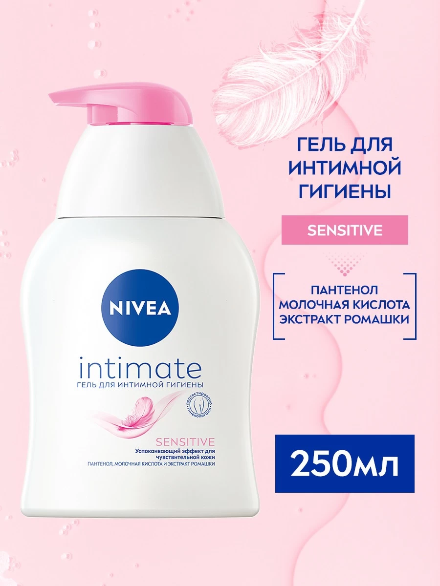 Formula delicată a emulsiei de duș Nivea Intimo Sensitive cu acid lactic menține un mediu sănătos și natural acid al părților intime, protejează împotriva infecțiilor. Adăugarea de aloe vera și pantenol duce la o calmare și hidratare optimă. De asemenea, nu conține substanțe iritante, săpun și coloranți artificiali. Previne eficient iritațiile și crește rezistența la afecțiunile feminine. Produsul este testat și aprobat din punct de vedere ginecologic, dermatologic și clinic.