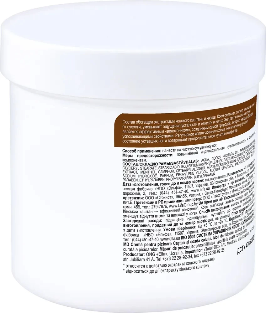 Compoziția este îmbogățită cu extracte de castan de India și coada calului. Crema înmoaie, hrănește, protejează pielea de uscăciune, reduce senzația de oboseală și greutate în picioare. Extractul de castan de cal este un "venotonic" eficient, creat de natura însăși, extractul de coada calului are proprietăți calmante. Utilizarea regulată a cremei îmbunătățește semnificativ starea picioarelor obosite și redă un sentiment de confort de durată.