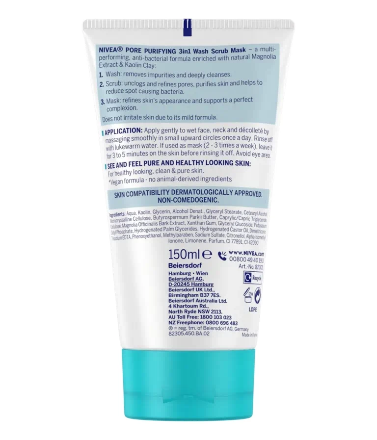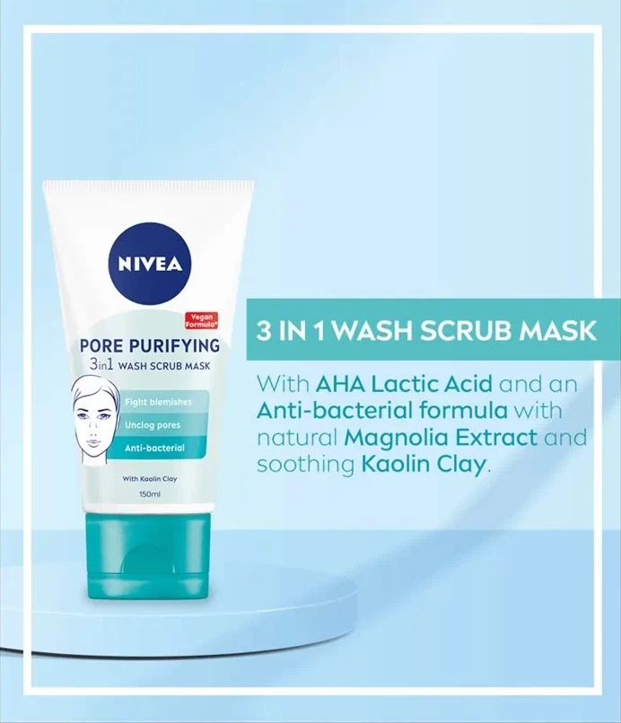 NIVEA® Pore Purifying 3in1 masca pentru exfoliere cu argila Kaolin este special creata pentru tenul cu probleme, predispus la acnee. Formula cu efect antibacterian si beneficii multiple, imbogatita cu argila Kaolin si extract natural de magnolie, te ajuta in lupta impotriva petelor, a punctelor negre si a cosurilor.