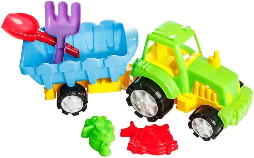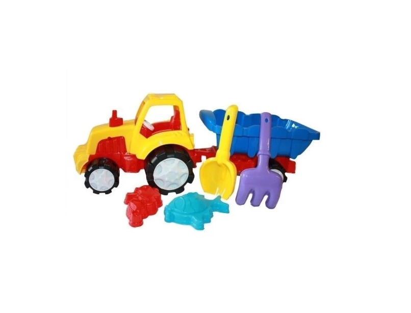 Tractor cu remorca si unelte, rezistent, ideal pentru activitati in parc, acasa, la nisip in constructiile celor mici. Acesta are atasata o remorca ce basculeaza si care poate fi incarcata cu ajutorul lopatelei si greblei incluse. Setul contine 2 forme de nisip.