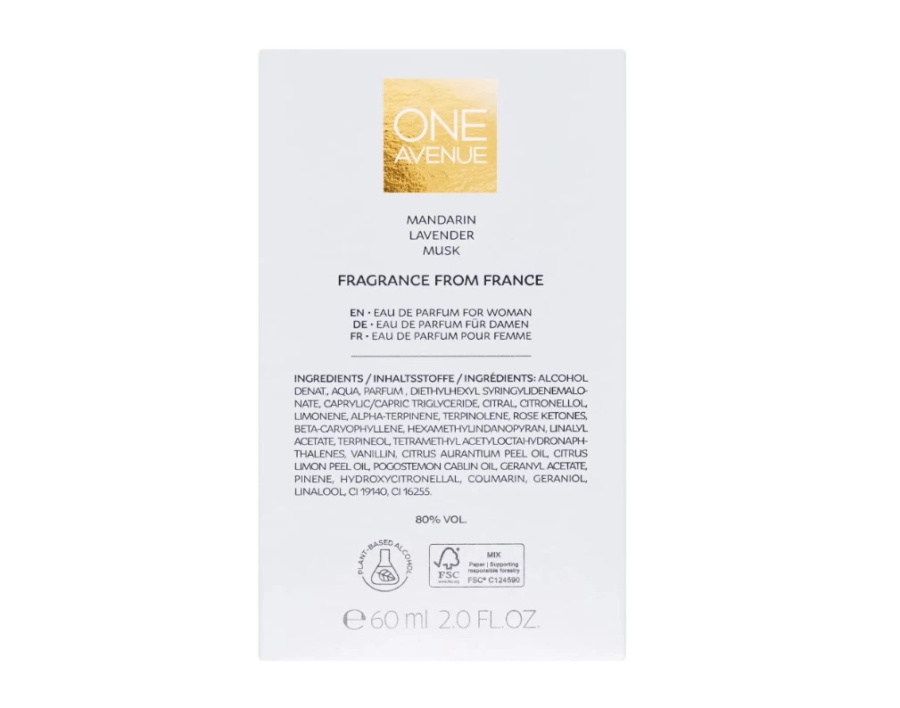 Alcool denat., apă, parfum, dietilhexil siringilidenemalonați, trigliceride caprilice/caprice, alcool benzilic, citronelol, geraniol, Hydroxycitronellal, Citral, Limonene, Linalool, Coumarin, CI 19140, CI 16255