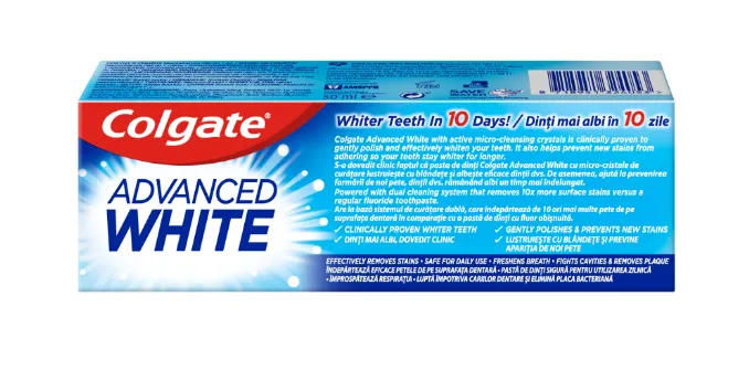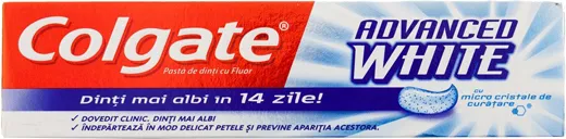 Pasta de dinti Colgate Advanced White contine micro cristale de curatare active care, dovedit clinic, indeparteaza in mod delicat petele, redand albul natural al dintilor tai. in plus, previne aparitia petelor, pentru ca dintii tai sa isi pastreze albul natural mai mult timp.